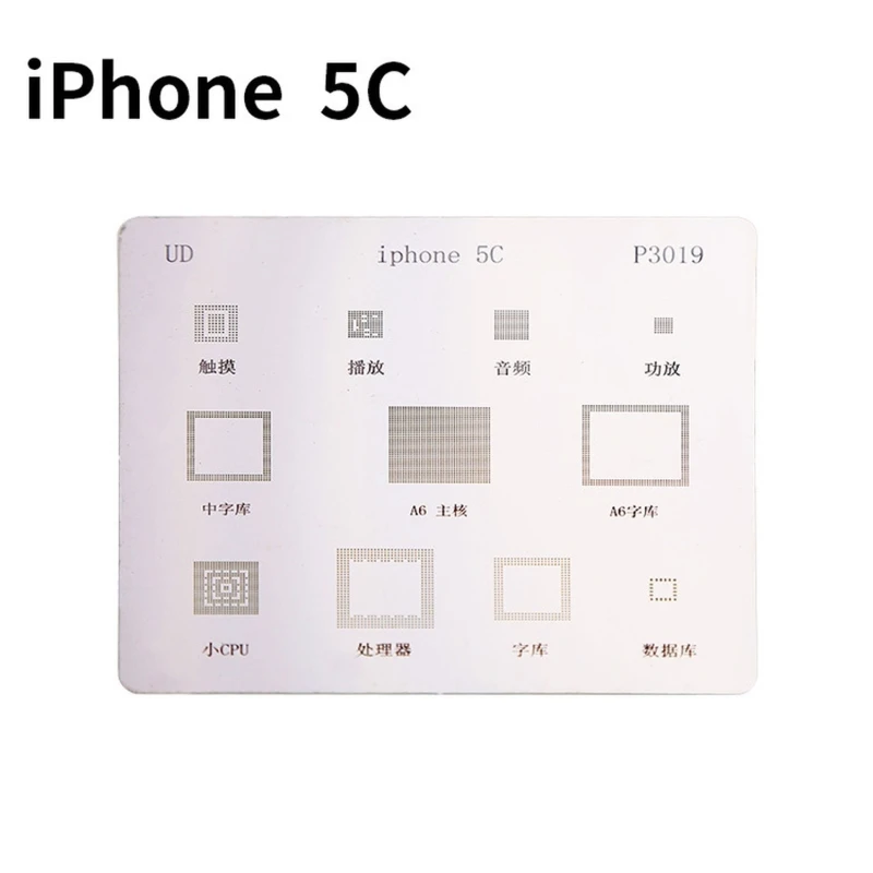 Šis stencil yra specialiai sukurtas iPhone 5C esantiems BGA integruotiems grandynams. Suderinamumas su kitais modeliais yra ribotas, nes padų išdėstymas gali skirtis tarp iPhone versijų ir modelių.