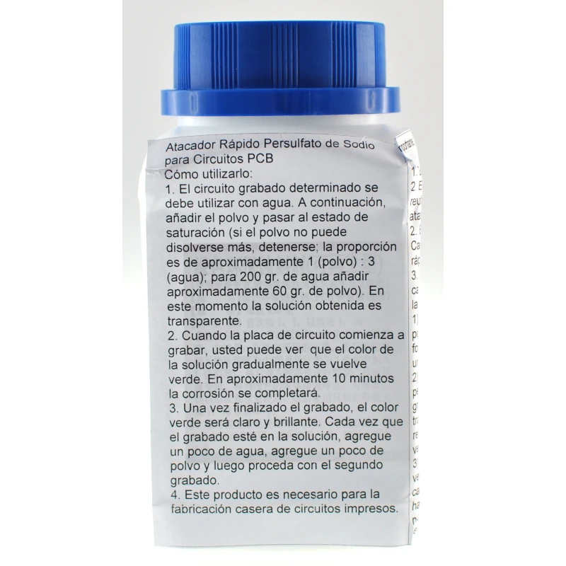 Šis produktas yra greitas ėsdiklis, specialiai sukurtas spausdintinių plokščių (PCB) ėsdinimui namuose arba elektronikos dirbtuvėse. Natrio persulfatas yra kieta medžiaga, kuri ištirpinta vandenyje sukuria skaidrų tirpalą, leidžiantį greitai ir efektyviai ėsdinti varį maždaug per 10 minučių.